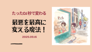 最悪を最高に変える魔法 (1200 x 680 px) 2025年9月15日 「「最悪」を0.1秒で「最高」に変える方法、あなたは知っていますか?」 コメントを残す コメントをキャンセル名前 (必須) メールアドレス(公開されません) (必須) ウェブサイト コメントコメント送信 Δ