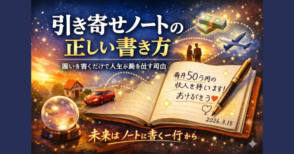 あとがき:人生って、大きな出来事で変わるというより、小さな習慣で静かに方向が変わっていくものなのかもしれません。ノートに願いを書く。たったそれだけのことなのに、自分の未来を少し意識するようになる。すると不思議なもので、今まで見えていなかったチャンスや、小さな行動のきっかけに気づくようになります。もしかすると、引き寄せの本当の意味は「宇宙が奇跡を起こす」ことではなく、自分の意識が未来の方向を選び始めることなのかもしれません。ほんの一行でいいのであなたの未来を書いてみてください。その一行が、いつか振り返ったときに「あの日から人生が少し変わった」。そんな始まりのページになっているかもしれません。