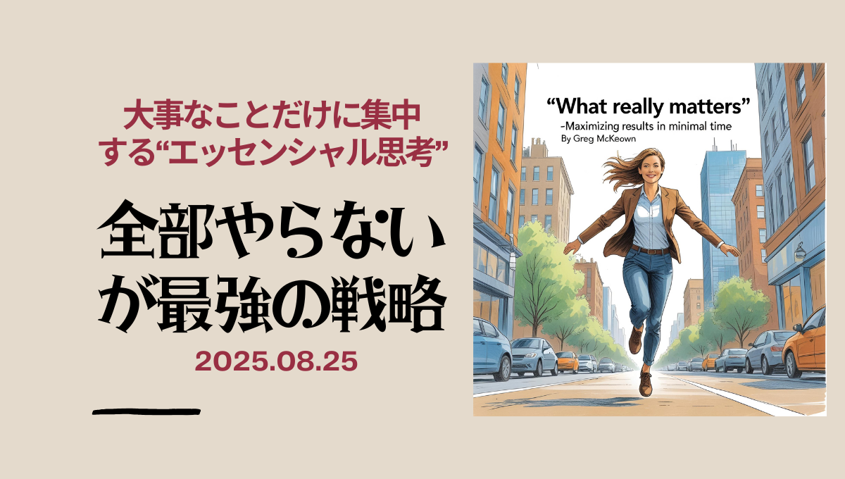 「もっとがんばらなきゃ」って、つい思ってしまう人にこそご紹介したい一冊がある。グレッグ・マキューンの『エッセンシャル思考』は、「がんばる方向が違うんじゃない?」と、やさしく教えてくれる。忙しいのに成果が出ない。やることが多すぎて毎日ぐったり。そんな状態から抜け出すヒントは、「全部やろう」とするのをやめて、「本当に大事なこと」だけに集中すること。今回は、そんなエッセンシャル思考のポイントを、日々の生活に当てはめながらエッセイ風によせてご紹介します。