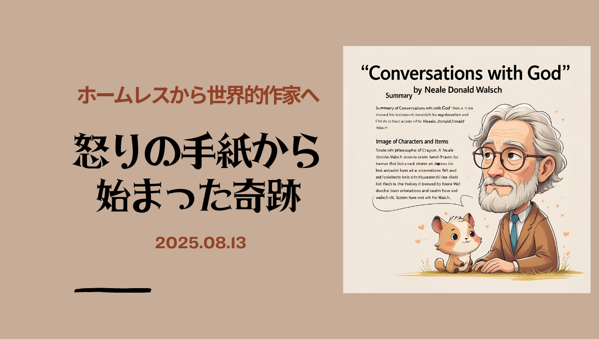 もし神様と直接おしゃべりできるとしたら、あなたは何を聞きますか?「お金のこと?」「恋愛のこと?」「この世の仕組み?」。実は、アメリカの作家ニール・ドナルド・ウォルシュさんは、人生のどん底でそれをやってしまった人です。しかもきっかけは“怒りの手紙”。「なんで俺の人生はこんなにうまくいかないんだ!」と、神様宛てにぶちまけたら、まさかの“返事”が来てしまった──。そこから始まったのが『神との対話』です。この本、ただのスピリチュアルじゃありません。日常のちょっとしたモヤモヤにも効く、まさかの人生取扱説明書。そのエッセンスを、今日もエッセイ風にお届けします。最後に、神様からの愛情に満ちたある言葉が書かれています。泣かないでね--。