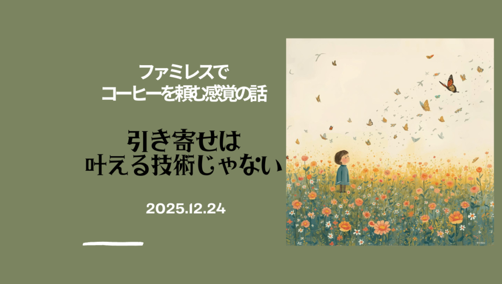 あとがき:今日は、少し楽でいい。もし今日、「ちゃんと引き寄せできてないかも」そう思っていたら。それは、あなたがダメだからじゃない。ただ、ちょっと力が入りすぎていただけ。今日は、少し肩の力を抜いてください。ファミレスでコーヒーを頼むみたいに、人生にも、気楽にオーダーしていい。引き寄せは、そのくらいで、ちょうどいいんです。引き寄せと願望実現とは違ううんですね。読んでくれて、ありがとう。