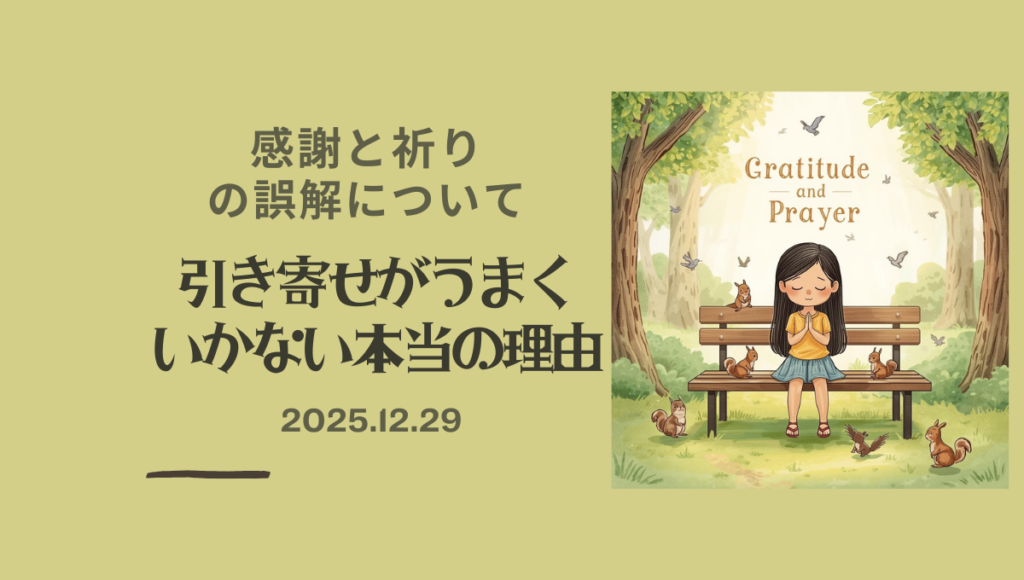 本ブログでは、”引き寄せの法則”について取り上げてきました。その中で、「感謝すればうまくいく」「祈れば導かれる」。そんな言葉に、幾度も救われた気がして、何度も信じてきた。それなのに、現実はあまり変わらない。むしろ、うまくいかない自分を責めてしまうことすらある。今回、参考になりましたYouTube動画から、そんな“違和感”にそっと光を当てている。感謝や祈りそのものが悪いのではない。でも、それだけで人生が動くと思い込むと、少しズレてしまう。そのズレこそが、引き寄せがうまくいかない正体だと教えてくれる。これは、スピリチュアルを否定する話ではない。むしろ、ちゃんと現実につなげるための、地に足のついたお話。エッセイ風によせて、”感謝”と”祈り”の作法についてのご紹介です。
