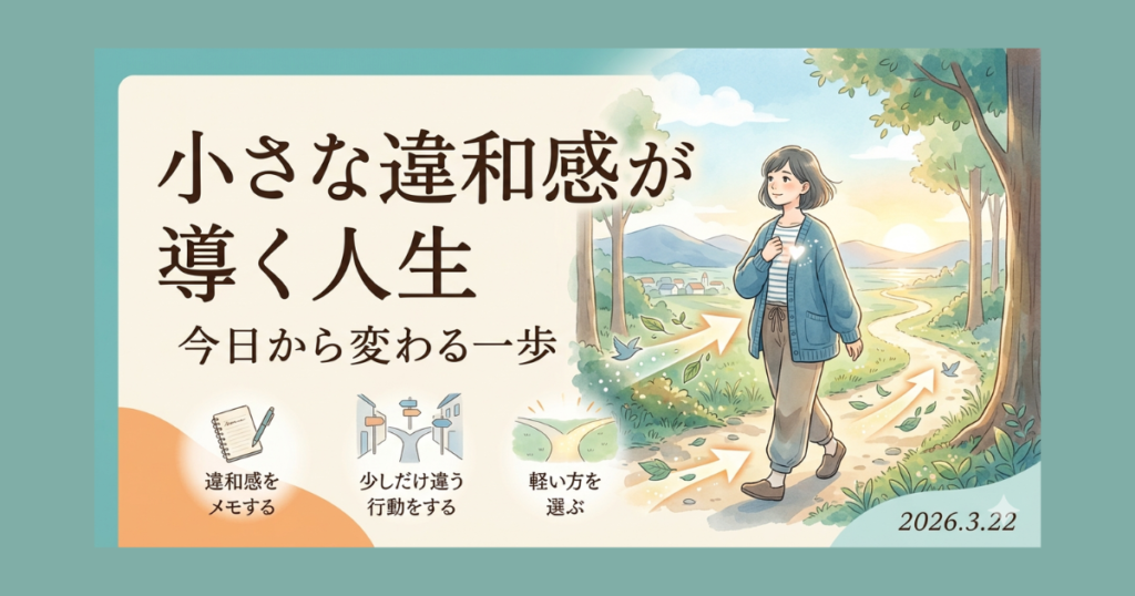 あとがき:「自分の感覚を信じる」って、なんだか達人みたいな言葉ですよね。でも実際は、「今日はカレーよりうどんの気分」くらいの話です。それを無視してカレーを選ぶと、なぜか心がモヤっとする。あれです。あの小さな違和感。人生もそれの連続かもしれません。壮大なテーマのようでいて、やっていることは意外と地味。でもその地味さが効いてきます。気づけば「あれ、前より楽かも」となる。そんな変化で十分です。明日はちょっとだけ、自分にやさしく。あなたのペースで大丈夫です。